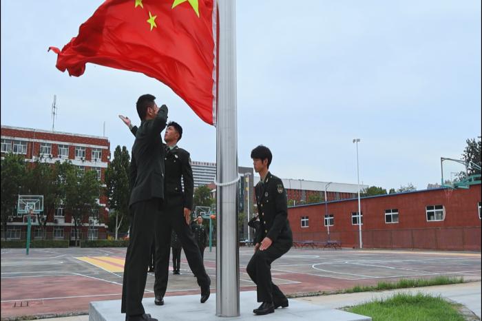 清晨的校园,晨光微熹。“起步——走!”随着一声铿锵有力的口令划破长空,原中国人民解放军仪仗司礼大队退伍军人、主旗手兼口令员冯志强带领护旗队员迈着坚定沉稳的步伐走向旗杆。他们的身姿挺拔如松,目光坚毅如炬。全场师生肃然起立,目光追随着那抹冉冉升起的鲜红。当国旗升至顶端,阳光洒在飘扬的旗帜上,红与金交织,仿佛历史与青春的无声对话,诉说着“吾辈当自强”的铮铮誓言。