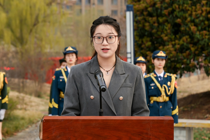 日新书院医学影像专业学生苗玉洁作为学生代表发言。她结合党的二十届四中全会精神与医学生学习生活实际,阐释雷锋精神的新时代内涵。她表示,雷锋精神并非抽象口号,而是体现在课堂互助、校园服务、专业钻研、服务群众的具体行动中。她号召全体同学以“螺丝钉精神”自勉,深耕专业、锤炼技能、践行担当,将个人成长与医疗卫生事业发展紧密结合,以青春之力守护人民健康,以实干行动致敬时代、不负韶华