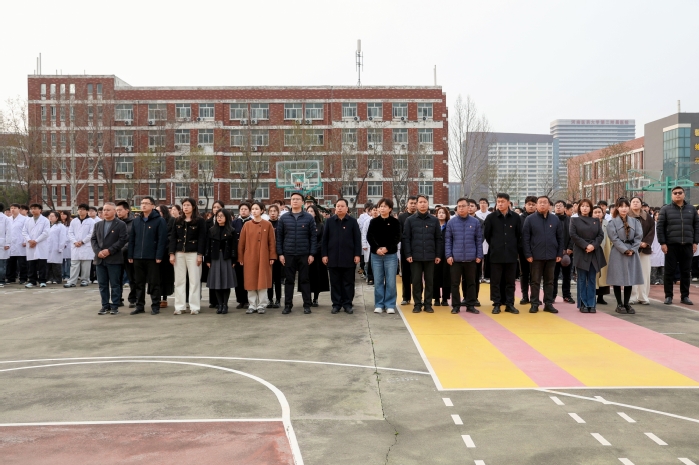 晨曦初照,全体参会人员着装整齐、肃立以待,以饱满的精神与诚挚的敬意迎接国旗入场。国旗护卫队步伐铿锵、姿态挺拔,护送五星红旗庄严抵达升旗台。伴随着雄壮激昂的《义勇军进行曲》,五星红旗冉冉升起,全体师生行注目礼、齐声高唱国歌,爱国情怀与医者初心在晨光中交融激荡。