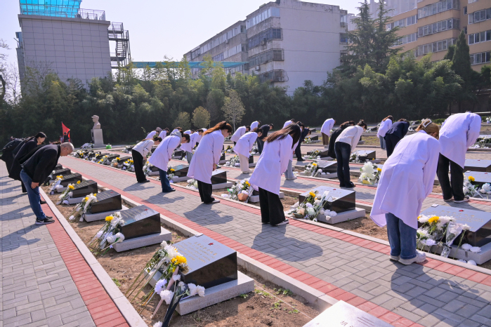 祭奠仪式结束后,师生们手持白菊,有序步入烈士墓区。在庄严肃穆的氛围中,全体人员肃立墓前,静默致哀、鞠躬致敬,朵朵白菊承载着跨越时空的思念,映照出新时代青年医者心中坚定的理想信仰。